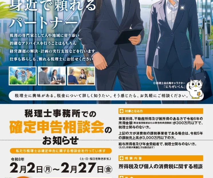 確定申告に関する相談会を行います。期間 2026年2月2日(月)~2月27日(金) ※土・日・祝を除きます 対象となる方 相談内容 所得税及び個人の消費税に関する相談 料 金 申告・納税に関する相談(30分程度)は無… 続きを読む »令和年7年度 確定申告相談会 -税理士事務所での無料相談会-